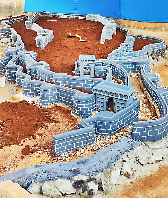 शिवरायांच्यासाठी सिंहासन तर संत रामदासासाठी चंद्रमोळी झोपडीही तयार केली जाते. उतरत्या पायऱ्यावर मावळे व नागरिकांसाठी खास वेगळी जागा तयार केली जाते. वाघ, सिंह या प्राण्यांसाठी मोक्मयाच्या जागेवर गुहा काढल्या जातात. गुहाबरोबरच आकर्षक कारंजे तयार केले जातात. कारंजामुळे किल्ल्यावरील माती सतत ओली राहाते. ओल्या मातीवर हळवी, मोहरी व इतर धान्य पेरून घनदाट अरण्यही उभे केले जाते. दोन-तीन दिवसाच्या अथक प्रयत्नानंतर तयार किल्ल्यासाठी आकर्षक मावळ्यांची खरेदी केली जाते.