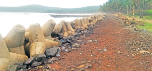 शहरानजीकच्या मिऱ्या धूपप्रतिबंधक बंधारा १९० कोटी खर्चुन उभारण्यात येत आहे. मिऱ्या बंधाऱ्याच्या अपूर्ण राहिलेल्या १,२०० मीटरच्या पांढरा समुद्र ते जयहिंद चौकापर्यंतचा कामाचा टप्पा शिल्लक आहे. मात्र त्यापुढील झालेल्या कामाच्या टप्प्यातील अलावा परिसरातील बंधाऱ्यांच्या रचलेल्या पायाचे दगड समुद्राच्या उधाणाने सरकले आहेत. त्यामुळे त्या दगडांवर रचलेले टेटापॉडही खाली खचले आहेत.
