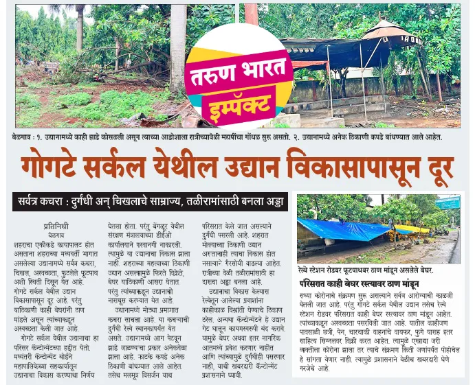 बेळगाव : गोगटे सर्कल येथील उद्यानाची दुरवस्था झाल्याचे वृत्त ‘तरुण भारत’ने प्रसिद्ध करताच कॅन्टोन्मेंट प्रशासनाला जाग आली. बुधवारी झालेल्या बोर्ड मिटिंगमध्ये गोगटे सर्कल येथील उद्यानाचे नूतनीकरण करण्यासंदर्भात चर्चा झाली. उद्योजक व स्वयंसेवी संस्थांच्या सहकार्यातून उद्यानाचा विकास केला जाईल, असे सांगण्यात आले. शहराच्या मध्यवर्ती भागातील गोगटे सर्कल येथे कॅन्टोन्मेंटचे उद्यान आहे. परंतु या उद्यानात मागील अनेक वर्षांपासून कोणतेही विकासकाम झालेले नाही. त्यामुळे बेघरांनी याठिकाणी आपला ठिय्या मांडला होता.