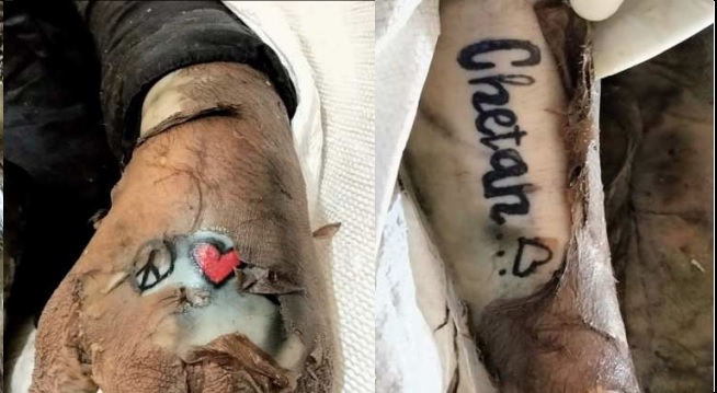 त्या तरुणाने आपल्या हातावर कन्नडमधून ‘गजा’ व इंग्रजीमधून ‘चेतन’ असे गोंदवून घेतले आहे. मनगटावर लाल रंगातून बदामाचे चित्र, हाताच्या कोपरावर इंग्रजीमधून ‘मॉम-डॅड’ व दोन बदामाची चिन्हे गोंदवून घेतली आहेत. मृतदेह सडलेल्या अवस्थेत असून आता गोंदलेल्या चिन्हांवरूनच त्याची ओळख पटविण्यात येत आहे. संबंधितांनी 9480804039 या क्रमांकावर सौंदत्ती पोलिसांशी संपर्क साधण्याचे आवाहन करण्यात आले आहे.