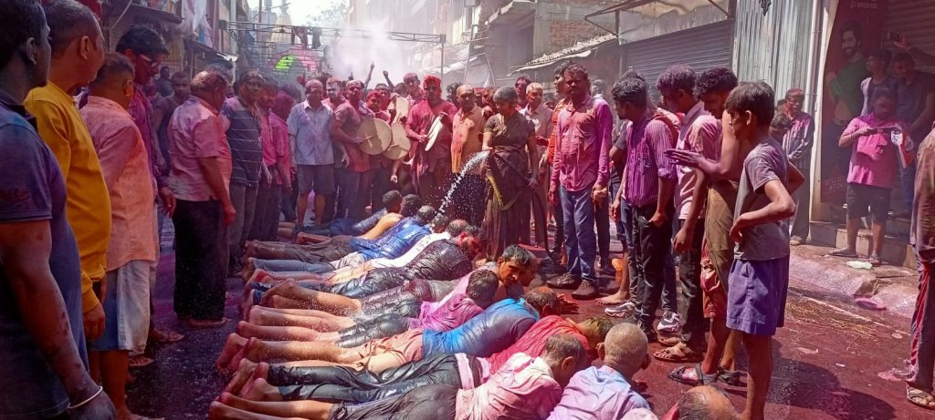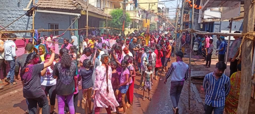 दक्षिण भारतातील एकमेव अश्वत्थामाचे मंदिर पांगूळ गल्ली येथे आहे. दरवर्षी रंगपंचमीच्या दिवशी मंदिरासमोर लोटांगण घातले जाते. आपल्या मनात असणाऱ्या मागण्या पूर्ण करण्यासाठी देवासमोर लोटांगण घालून गाऱ्हाणे घातले जाते. पारंपरिक पद्धतीने सोमवारी रात्री होळीचे पूजन करण्यात आले. त्यानंतर अश्वत्थामाला अभिषेक करण्यात आला. मंगळवारी सकाळपासून दर्शनासाठी भाविकांच्या रांगा लागल्या होत्या. बेळगावसह परिसरातील शेकडो भाविक लोटांगण घालण्यासाठी मंदिर परिसरात दाखल झाले होते. दुपारी 1.30 नंतर लोटांगण घालण्यात आले. 10 ते 12 हजार भाविकांच्या उपस्थितीत लोटांगणाचा कार्यक्रम पार पडला. आज प्रत्येक सणाचा इव्हेंट झाला आहे. होळी व रंगपंचमी आपल्या मित्र मैत्रिणींसोबत साजरी करण्यासाठी हॉटेल बुक केली जात आहेत. शहर व परिसरातील काही हॉटेलमध्ये रंगपंचमीचा इव्हेंट आयोजित केला होता. मोजक्याच नागरिकांच्या उपस्थितीत रंगोत्सवाचा आनंद घेता यावा यासाठी बऱ्याच जणांनी अशा प्रकारे हॉटेलवर जाऊन रंगोत्सवाचा आनंद घेतला.