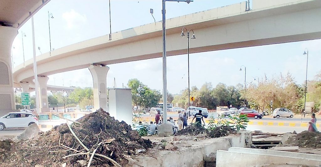 आता दोन महिन्यापूर्वीच या पुलाच्या भागात वाहतूक बेट उभारणे आणि अन्य सुविधा निर्माण करण्याच्या कामास प्रारंभ करण्यात आला होता. मात्र सदर मातीचे प्रमाण एवढे प्रचंड आहे की, आतापर्यंत शेकडो ट्रक भरतील एवढी माती काढण्यात आल्यानंतरही अद्याप तेथे मोठ्या प्रमाणात माती व अन्य कचरा शिल्लक आहे. भरीस तेथील जलनिचरा व्यवस्था पार लयास गेली आहे. पूर्वी कधीतरी टाकलेले विविध प्रकारचे केबल्स अस्ताव्यस्थ पसरलेले आहेत. ते तुटू नयेत याची खबरदारी घ्यावी लागत असल्याने कामास गतीच मिळत नाही. त्याशिवाय तेथे पाईप टाकणे, चेंबर्स बांधणे आदी कामेही हाती घेण्यात आली असल्याने ऐन पावसाच्या तोंडावर ती पूर्ण होणे शक्यतेच्या बाहेरील ठरले आहे. त्यामुळे यंदाच्या पावसात हा संपूर्ण भाग पाण्याखाली जाण्याची शक्यता वर्तविण्यात आली आहे.