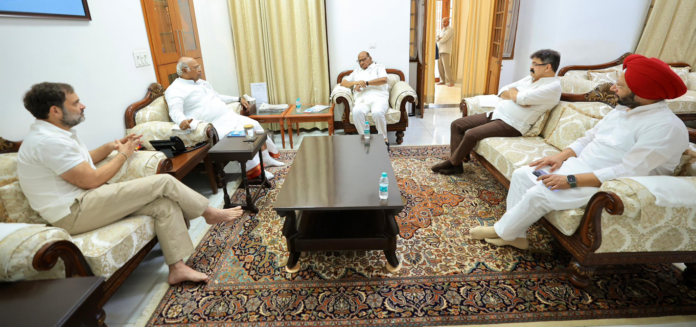 ‘इंडिया’ आघाडीतील दोन महत्त्वाच्या घटक पक्षांचे नेते पुन्हा एकदा शुक्रवारी एकत्र दिसले. राष्ट्रवादीचे अध्यक्ष शरद पवार यांनी शुक्रवार, 6 ऑक्टोबरला काँग्रेसचे राष्ट्रीय अध्यक्ष मल्लिकार्जुन खर्गे आणि काँग्रेस नेते राहुल गांधी यांची भेट घेतली. विरोधी पक्षांची युती असलेल्या ‘इंडियन नॅशनल डेव्हलपमेंटल इन्क्लुझिव्ह अलायन्स’च्या (इंडिया) योजनांवर चर्चा करण्यासाठी दोन्ही महत्त्वाच्या पक्षनेत्यांची ही भेट झाल्याची माहिती सूत्रांनी दिली. या बैठकीनंतर काँग्रेसचे अध्यक्ष खर्गे यांनी या भेटीचे काही फोटो सोशल मीडियावर अपलोड करत ‘आम्ही प्रत्येक आव्हानासाठी सज्ज आहोत. जुडेगा भारत, जितेगा इंडिया’ अशी टॅगलाईन जारी केली.