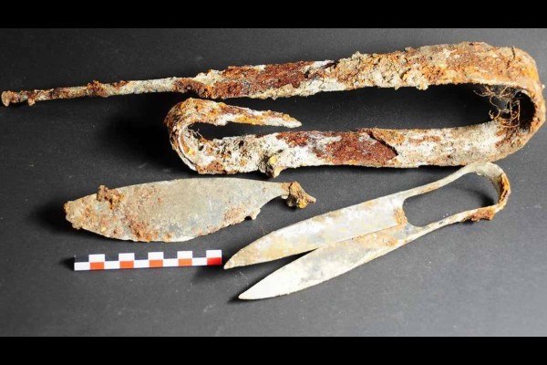 बीएलएफडीच्या पथकाला संबंधित ठिकाणी एक वाकलेली तलवार, एका ढालीचे अवशेष, एका भाल्याचे टोक आणि मानवी पायाचे हाड इत्यादी सामग्री सापडली आहे. तलवार वाकविण्यापूर्वी ती गरम करण्यात आली असावी असे संशोधकांचे मानणे आहे. लुटींनी थडग्याचे नुकसान करून नये म्हणून त्यांना हतोत्साहित करण्यासाठी तलवार वाकविण्यात आल्याचे मानले जाते. तलवारीचे स्वरुप बिघडविणे एखाद्या गोष्टीचे प्रतीक देखील असू शकते. परंतु या सर्व सामग्रींमध्ये सर्वाधिक लक्ष कात्रीने वेधून घेतले आहे.