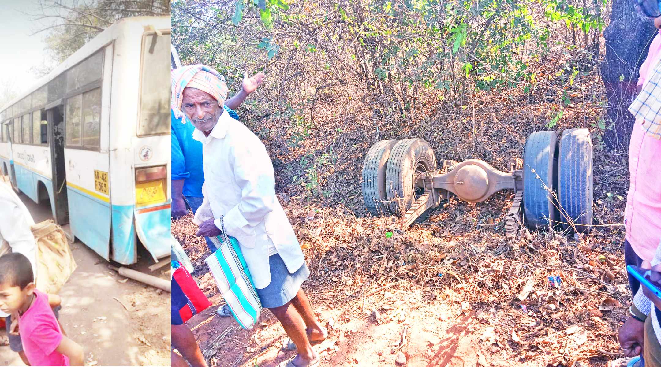 खानापूर : खानापूर आगाराची बस क्रमांक के 22 एफ 363 ही रोजच्याप्रमाणे सकाळी 8 वाजता जामगाव येथे गेली होती. जामगावहून परत येताना शेडेगाळी जवळ या बसचे मागील टायरचे एक्सल तुटल्याने दोन्ही टायर बसपासून बाजूला निखळून पडल्याने बस रस्त्याच्या शेजारील गटारीत कलंडली. चालकाच्या प्रसंगावधानामुळे बस रस्त्याच्या कडेला कलंडली. मात्र, प्रवासी असून देखील कोणालाही मोठी दुखापत झाली नाही. चालकाच्या सावधगिरीमुळे मोठा अनर्थ टळला. आज रविवार असल्याने या बसमध्ये विद्यार्थ्यी नव्हते. बाजारासाठी येणाऱ्या लोकांची या बसमध्ये किरकोळ गर्दी होती. खानापूर आगारात ग्रामीण भागासाठी जुन्या मोडकळीस आलेल्या बसेस वापरण्यात येत आहेत. त्यामुळे वारंवार असे छोटे-मोठे अपघात होत आहेत. यामुळे तालुक्यात संताप व्यक्त होत आहे. ग्रामीण प्रवाशांच्या जीवाशी खेळ चालवल्यासारखाच हा प्रकार आहे. खानापूर तालुक्यातील संपूर्ण ग्रामीण भागात सोडलेल्या सर्व बसेस अत्यंत जुनाट आणि पूर्णपणे नादुरुस्त असून, त्या बस वाहतुकीसाठी वापरण्यात येत आहेत. आमदार विठ्ठल हलगेकर यांनी याबाबत परिवहन मंत्र्यांकडे याचा पाठपुरावा करून खानापुरातील ग्रामीण भागासाठी चांगल्या सुस्थितीतील बस वापरण्यात येण्यासाठी प्रयत्न करणे गरजेचे आह