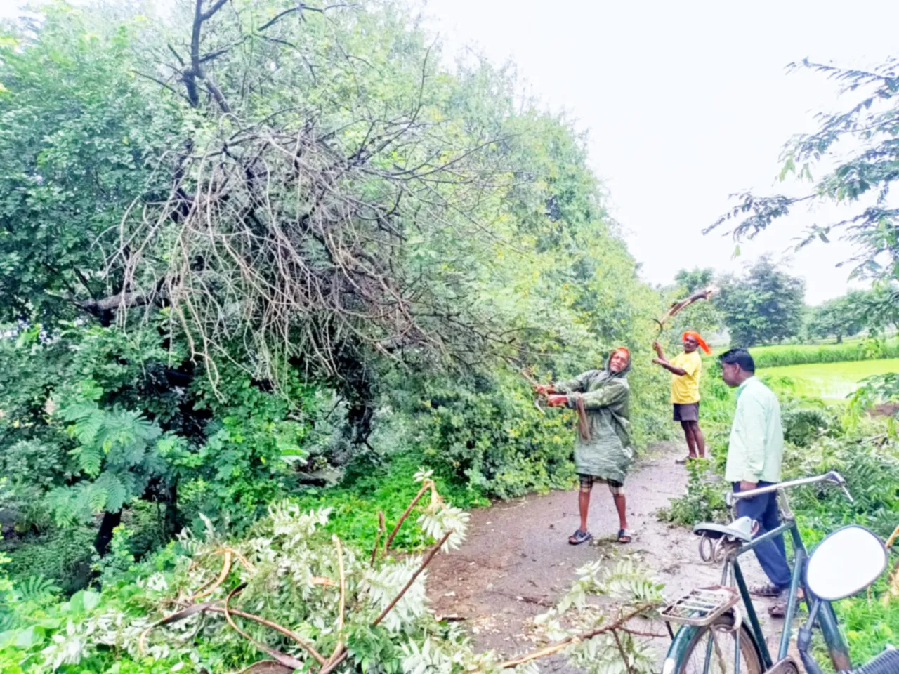 हनुमाननगरमधून अनगोळ शिवारात जाणाऱ्या रस्त्यावर बाभळीचे झाड उन्मळून पडल्याने वाहतूक बंद पडली असून शेतकऱ्यांनी ये-जा करण्यासाठी तात्पुरती पायवाट करून मार्ग काढला आहे. उन्हाळ्यात रोजगार हमी योजनेतून बळ्ळारी नाल्याकडे शिवारातून जाणाऱ्या कालव्याची खोली वाढवण्यासाठी खोदाई केली होती. कालव्याच्या दोन्ही बाजुला असणाऱ्या अनेक झाडांची मुळे सैल झाली होती. पाऊस आणि वारा यामुळे आता झाडे उन्मळून पडण्याच्या घटना घडत असून याआधीही अशी झाडे पडण्याच्या घटना घडल्या आहेत. पण पर्यायी मार्ग असल्याने त्यावेळी फारशी अडचण भासली नाही. ही घटना सकाळी सहाच्या दरम्यान घडल्यामुळे सकाळी शिवाराकडे जाणाऱ्या दुचाकी वाहनधारकांची मोठी गैरसोय झाली. रस्त्याखालील वाफ्यातील पिकांतून लोकांची ये-जा बघून शेतकऱ्यांनी नुकसान टाळण्यासाठी तात्पुरती एक-दोन फुटाची वाट करून पर्याय काढला आहे. पावसाची उघडीप बघता शेतीकामासाठी शेतकऱ्यांना ये-जा करण्यासाठी झाडाची विल्हेवाट लावून मार्ग मोकळा करावा, अशी मागणी शेतकऱ्यांनी केली आहे.