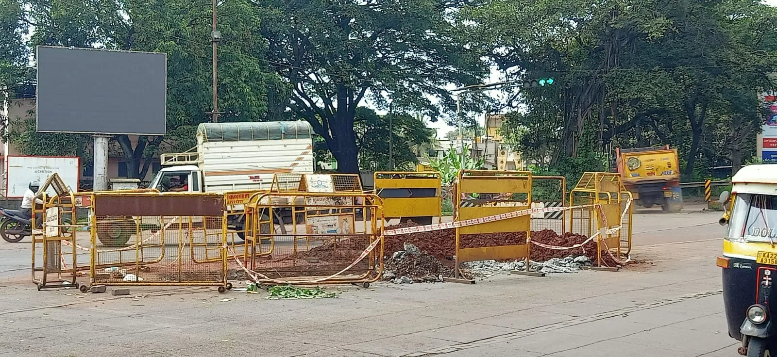 गोगटे सर्कलच्या मध्यभागी खोदाई करण्यात आली असून बाजूने बॅरिकेड्स लावण्यात आले आहेत. दुरुस्तीचे काम करताना पावसाच्या पाण्याचा अडसर होत असल्याने काम लांबणीवर पडत आहे. हेस्कॉमच्या अधिकाऱ्यांना या संदर्भात विचारले असता पाण्यामुळे दुरुस्ती करणे अशक्य होत आहे. त्यामुळे पाणी सुकल्यानंतर दुरुस्ती शक्य होईल. अद्याप आठवडाभराचा कालावधी लागण्याची शक्यता आहे. परंतु, यामुळे वाहनचालकांना मात्र वाहतूक कोंडीचा सामना करावा लागत आहे. विशेषत: सकाळी व सायंकाळी गोगटे सर्कल येथे गर्दी वाढत असल्याने वाहतूक कोंडी होत आहे. त्यामुळे दुरुस्तीचे काम वेळेत संपविण्याची मागणी होत आहे.
