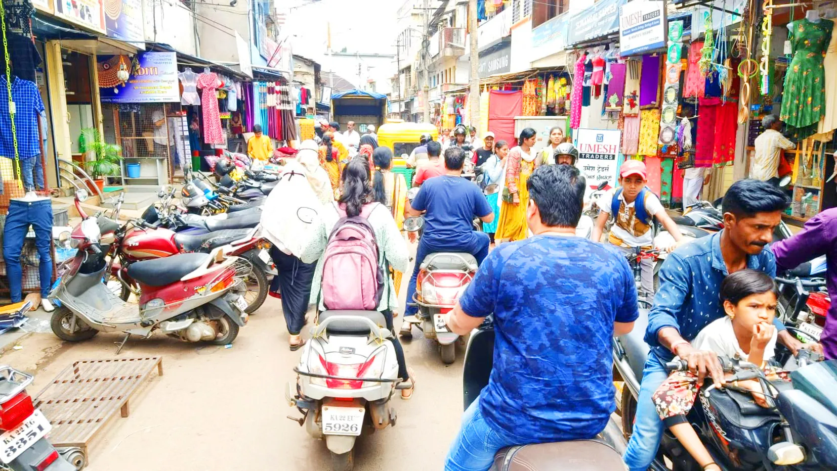 खरेदीसाठी नागरिकांची गर्दी : वाहनधारकांची कसरत, रस्त्याच्या दोन्ही बाजूला दुचाकींचे पार्किंग केल्याने कोंडीत भर