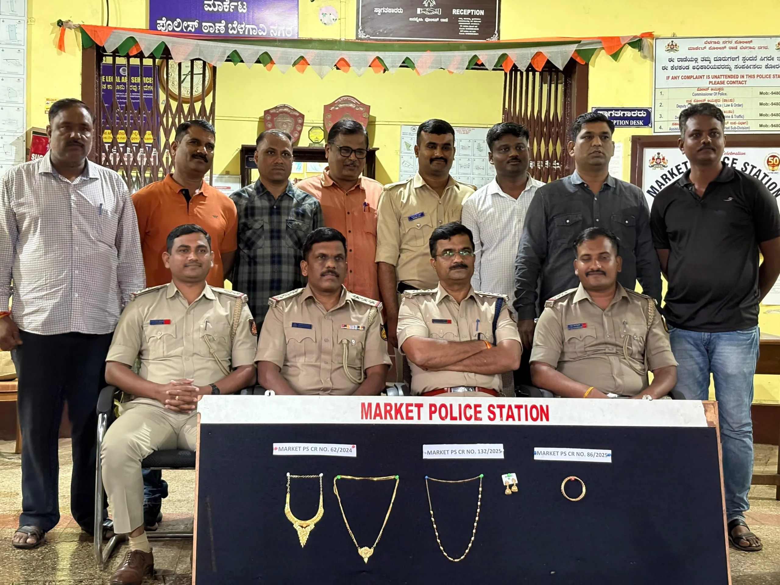 मार्केटचे एसीपी सदाशिव कट्टीमनी यांच्या मार्गदर्शनाखाली पोलीस निरीक्षक महांतेश धामण्णावर, उपनिरीक्षक एच. एल. केरुर, एस. जी. कुगटोळी, सुरेश कांबळे, एल. एस. कडोलकर, आशिर जमादार, कार्तिक जी. एम., एम. बी. वडेयर, तांत्रिक विभागाचे रमेश अक्की व महादेव काशिद आदींचा समावेश असलेल्या पथकाने या जोडगोळीला अटक करून दागिने जप्त केले आहेत. चालूवर्षी दोन व गेल्यावर्षी एक असे एकूण तीन गुन्हे केल्याची कबुली या जोडगोळीने दिली आहे. त्यांनी दिलेल्या माहितीवरून 9 लाख 31 हजार रुपये किमतीचे 95 ग्रॅम सोन्याचे दागिने जप्त करण्यात आले आहेत. पोलीस आयुक्तांनी या कारवाईत भाग घेतलेल्या अधिकारी व पोलिसांचे कौतुक केले आहे.