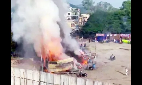 आंध्रप्रदेशातील विजयवाडा जिल्हय़ात गांधीनगर येथील जिमखाना मैदानावरील फटाक्मयांच्या स्टॉलला रविवारी सकाळी भीषण आग लागली. या दुर्घटनेमध्ये दोघांचा मृत्यू झाला आहे. दिवाळी सणानिमित्त मैदानावर फटाक्यांची स्टॉल्स उभारण्यात आली होती. यापैकी एका स्टॉलमध्ये आगीचा भडका उडाल्यानंतर आजुबाजुच्या तीन-चार दुकानांमधील लाखो रुपयांचे फटाकेही जळून गेले. या दुर्घटनेनंतर अग्निशमन दलाच्या जवानांनी घटनास्थळी धाव घेत आग विझवण्यासाठी शर्थीचे प्रयत्न केले. या दुर्घटनेचा व्हिडीओ व्हायरल झाला असून त्यात आगीच्या ज्वाळा आणि धुराचे लोट उठताना दिसत आहेत. आग दुर्घटनेमागील नेमके कारण स्पष्ट झालेले नाही. याप्रकरणी तपास सुरू असल्याचे सांगण्यात आले.