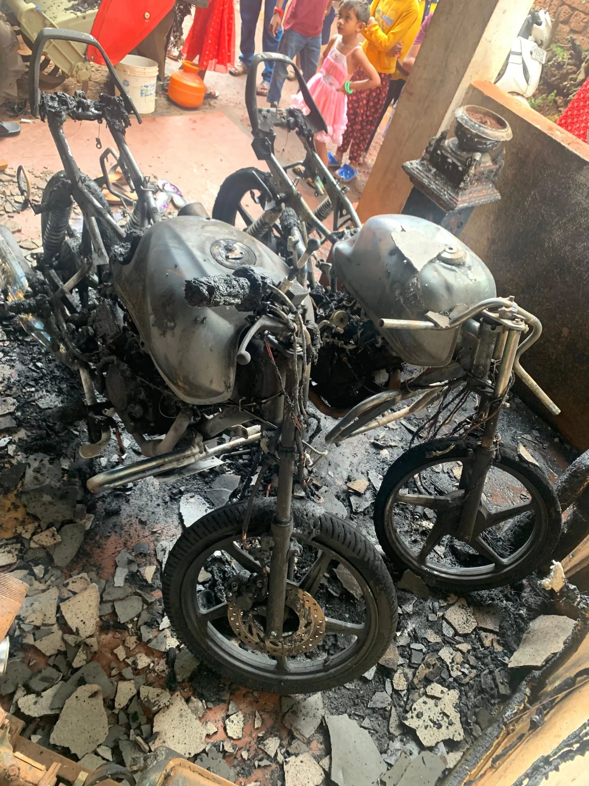 बेळगाव : घरासमोर उभ्या करण्यात आलेल्या दोन दुचाकींनी पेट घेतल्याची घटना संतिबस्तवाड येथे घडली असून या आग दुर्घटनेत दोन लाख रुपयाहून अधिक नुकसान झाले आहे. यासंबंधी कल्लाप्पा बिर्जे यांनी बेळगाव ग्रामीण पोलीस स्थानकात फिर्याद दिली आहे. घरासमोर नवीन होंडा शाईन उभी करण्यात आली होती. त्याच्या शेजारी आणखी एक जुनी होंडा शाईन होती. शॉर्टसर्किटने या दोन्ही वाहनांना आग लागल्याचे कल्लाप्पा यांनी फिर्यादीत म्हटले आहे. बेळगाव ग्रामीण पोलीस स्थानकात या घटनेची नोंद झाली आहे. मंगळवारी मध्यरात्रीनंतर ही घटना घडली आहे.