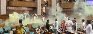 संसदेवर झालेल्या भीषण दहशतवादी हल्ल्याला 22 वर्षे पूर्ण झाल्याच्या दिवशी पुन्हा एकदा संसदेची सुरक्षा तोडण्याचा प्रकार घडला आहे. लोकसभेचे कामकाज होत असताना, प्रेक्षागारात बसलेल्या दोन तरुणांनी सभागृहात उड्या मारल्या आणि स्वत:जवळ असणाऱ्या नळकांड्यांमधून पिवळा धूर सोडला. यामुळे काहीकाळ प्रचंड गोंधळ उडाला. या तरुणांनी मागच्या बाजूला असणाऱ्या खासदारांच्या बाकांवरुन उड्या मारल्या. नंतर काही खासदारांनी त्यांना पकडले. तोपर्यंत सुरक्षा रक्षकांनी सदनात प्रवेश करुन त्यांना ताब्यात घेतले. या घटनेत कोणीही जखमी झाले नाही. संसदेबाहेरच्या दोघांपैकी एकजण महाराष्ट्रातील लातूर जिल्ह्यातील असून त्याचे नाव अमोल शिंदे असल्याची माहिती प्राथमिक तपासानंतर देण्यात आली आहे. संसदेत घुसलेल्या युवकांची नावे सागर शर्मा आणि मनोरंजन अशी आहेत. हे व्यापक कटकारस्थानच आहे, असे प्राथमिक तपासातून निष्पन्न झाले आहे.