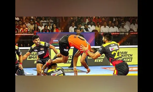 व्हिवो पुरस्कृत नवव्या प्रो कबड्डी लिग स्पर्धेतील शनिवारी येथील श्री कंठीरेव्वा स्टेडियमवर झालेल्या सामन्यात भरतच्या शानदार कामगिरीच्या जोरावर यजमान बेंगळूर बुल्सने यु मुम्बाचा 42-32 अशा दहा गुणांच्या फरकाने पराभव केला. या सामन्यात मध्यंतरापर्यंत यु मुम्बाने बेंगळूर संघावर 24-11 अशी भक्कम आघाडी घेतली होती.