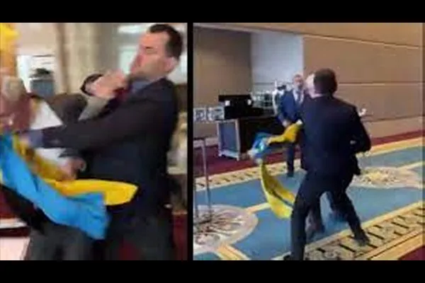 युक्रेनच्या एका खासदाराने रशियाच्या प्रतिनिधीला ठोसा लगावला आहे. तुर्कियेच्या अंकारा शहरात सुरू असलेल्या ब्लॅक सी इकोनॉमिक कोऑपरेशनच्या बैठकीदरम्यान ही धक्कादायक घटना घडली आहे. या बैठकीदरम्यान छायाचित्रणाचे सत्र सुरू होते. युक्रेनचे खासदार ऑलेक्झेंडर मारिकोव्स्की यावेळी युव्रेनचा ध्वज घेऊन उभे हेते, तेव्हा रशियाच्या प्रतिनिधीने त्यांच्या हातातील ध्वज हिसकावून घेत तो फेकला होता.