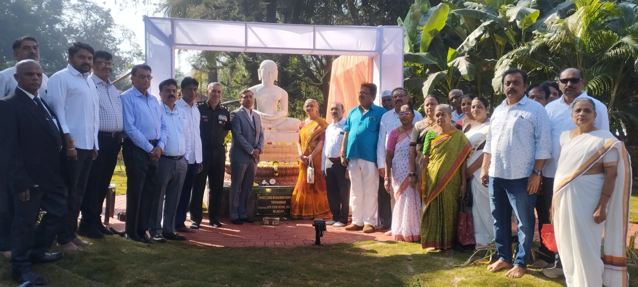 बेळगाव : कॅन्टोन्मेंट कार्यालयाच्या परिसरात बसविण्यात आलेल्या भगवान महावीरांच्या मूर्तीचे अनावरण सोमवारी थाटात करण्यात आले. मठ गल्ली येथील जैन युवा मंडळाच्यावतीने महावीरांची भव्य मूर्ती कॅन्टोन्मेंट परिसरात बसविण्यात आली आहे. सोमवारी लष्कर दिनाचे औचित्य साधून मान्यवर व जैन बांधवांच्या उपस्थितीत मूर्तीचे अनावरण करण्यात आले. कॅन्टोन्मेंटचे अध्यक्ष ब्रिगेडियर जॉयदीप मुखर्जी, सीईओ राजीवकुमार, नामनिर्देशित सदस्य सुधीर तुपेकर यांच्या उपस्थितीत महावीरांच्या मूर्तीचे अनावरण झाले. यावेळी बोलताना हिराचंद कलमनी म्हणाले, महावीरांची मूर्ती बसविण्यासाठी मागील दोन महिन्यांपासून जैन युवक मंडळाचे पदाधिकारी कार्यरत होते. त्यांच्या मेहनतीतून सुंदर अशी मूर्ती कॅन्टोन्मेंट कार्यालय परिसरात बसविण्यात आली. यासाठी त्यांनी कॅन्टोन्मेंट प्रशासनाचेही आभार मानले. यावेळी अध्यक्ष सुनील चौगुले, पद्मराजा वैजन्नावर, अरुण बेल्लद, सिद्धार्थ अमानजी, सनीत चौगुले, राजेश कलमनी, सुरेश चौगुले, कार्तिक पाटील, सुरेखा गौरगोंडा यांच्यासह जैन बांधव उपस्थित होते.