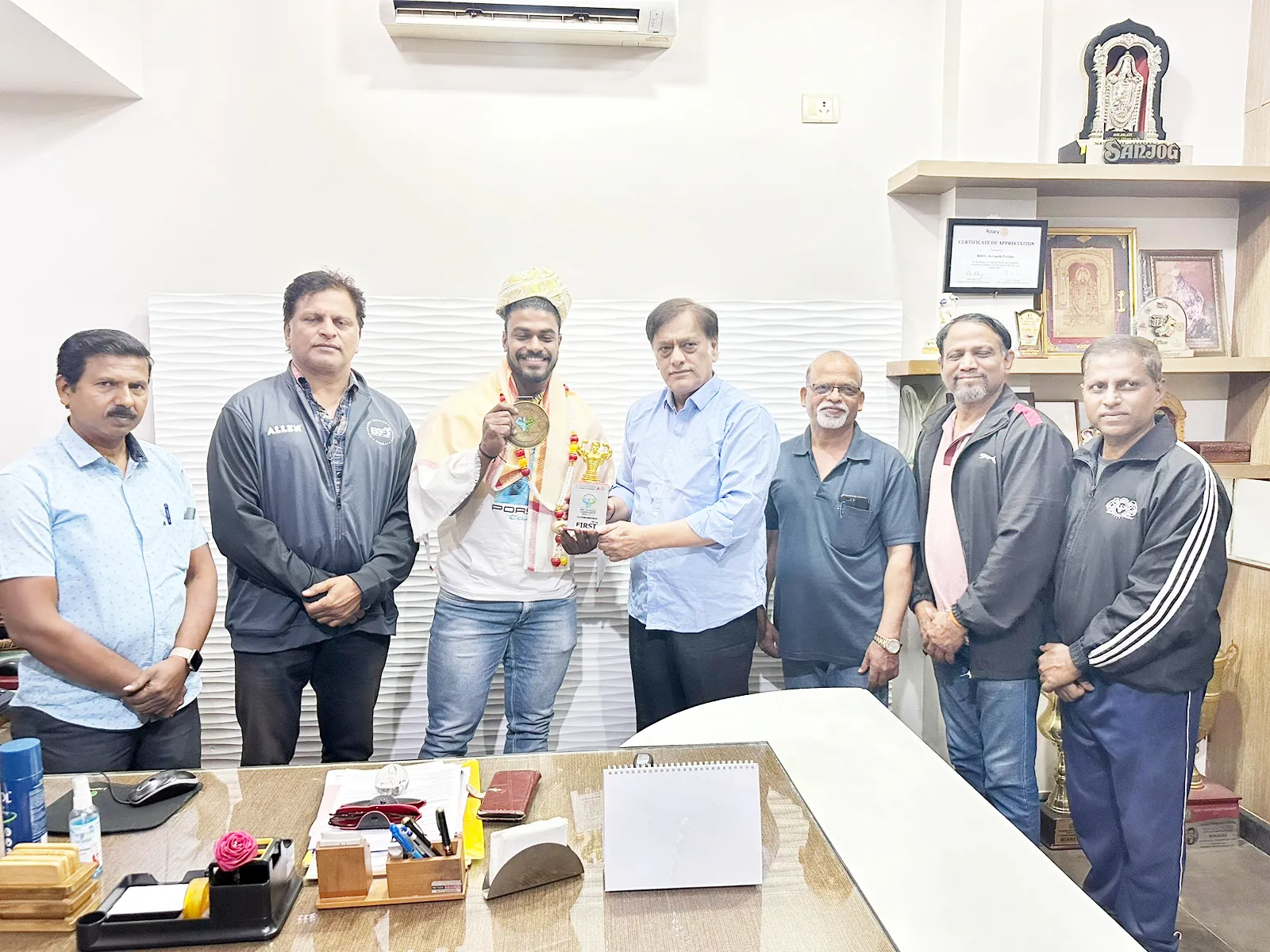 बेळगाव : नुकत्याच मंगळूर येथे झालेल्या ऑल इंडिया विद्यापीठ शरीरसौष्ठव स्पर्धेत 85 किलो वजनीगटात सुवर्णपदक पटकाविलेल्या बेळगाव आरसीयुचा शरीरसौष्ठवपटू व्ही. बी. किरण याचा खास सत्कार बेळगाव जिल्हा शरीरसौष्ठव संघटनेतर्फे करण्यात आला. नर्तकी सिनेमाघरात आयोजित करण्यात आलेल्या कार्यक्रमात बेळगाव जिल्हा शरीरसौष्ठव संघटनेचे अध्यक्ष अविनाश पोतदार, एम. के. गुरव, सचिव अजित सिद्दण्णावर, गंगाधर एम., हेमंत हावळ, सुनील राऊत आदी मान्यवर उपस्थित होते. व्ही. बी. किरणने केलेल्या कामगिरीची दखल घेऊन त्याचा खास शाल, श्रीफळ, भेटवस्तू देऊन शुभेच्छा देण्यात आल्या. पुढील काळातही अशाच कामगिरीची आशा बाळगून शरीरयष्टी मजबूत करण्याचा सल्ला यावेळी अविनाश पोतदार यांनी दिला. या स्पर्धेत सुवर्णपदक पटकाविणारा व्ही. बी. किरण हा बेळगावचा पहिला शरीरसौष्ठवपटू आहे. त्याच्या या कामगिरीने बेळगावचे नाव उंचावले आहे.