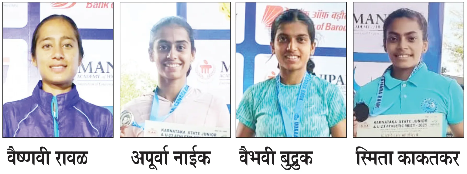 बेळगाव : उडुपी येथे झालेल्या कर्नाटक राज्य ज्युनियर स्पर्धेत 20 वर्षांखालील गटात बेळगावचे मुली वैष्णवी रावळ, वैभवी बुद्रुक, स्मिता काकतकर, अपूर्वा नाईक यांनी या स्पर्धेत आतुलनिय कामगिरी करत राज्यस्तरीय वैष्णवी रावळ नवा रेकॉर्ड नोंदविला आहे. या स्पर्धेत वैष्णवी रावळने 800 मी. नव्या रेकॉर्डसह 2:12.00 सेकंद व 1500 मी 4:32.93 सेकंद वेळ नोंदवून सुवर्ण,वैभवी बुद्रुकने 100 मीटरमध्ये 12:37 सेकंद अंतर नोंदवून द्वितीय आणि 200 मी 25:47 सेकंद अंतर नोंदवून सुवर्ण, स्मिता काकतकरने 11.18 मी. तिहेरी उडीत कांस्य, अपूर्वा आनंद नाईकने 100 मीटर अडथळा शर्यती 1:03.00 व 400 मी 15.45 सेकंद गटात 400 मीटर अडथळा शर्यती सुवर्ण पटकावले आहे.या स्पर्धेकांना प्रशिक्षकाचे प्रोत्साहान व मार्गदर्शन लाभत आहे.