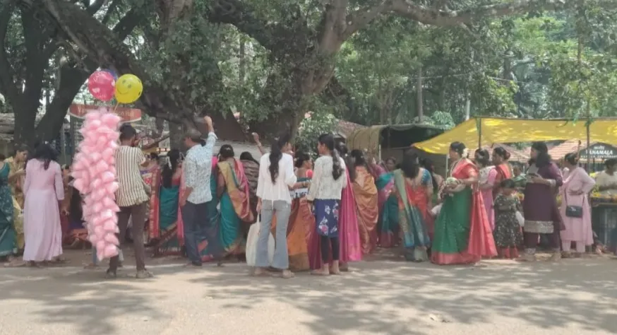 खानापूर : खानापूर तालुक्यातील ग्रामीण भागासह शहरात सुवासिनीनी वटपौर्णिमेनिमित्त वडाच्या झाडाची मनोभावे पूजा करून झाडाला सुत बांधून फेरे घालत साकडेही घातले. त्यामुळे दिवसभर वडाच्या झाडाच्या परिसरात सुवासिनींची मोठी गर्दी दिसून येत होती. मंगळवारी सकाळपासूनच खानापूर शहरातील महिला पुजेचे साहित्य घेऊन स्टेशनरोडवरील सती माता मंदिराच्या आवारातील वडाच्या झाडाचे पूजन करत होते. दिवसभर सुवासिनींची गर्दी होती. पावसाने उघडीप दिल्याने सुवासिनीनी वडाच्या पूजेबरोबरच शहरातील मंदिरांच्याही भेटी घेऊन देवाचे दर्शन घेतले. तसेच मऱ्याम्मा देवीची यात्रा असल्याने महिलांनी यात्रेच्या ठिकाणीही जावून दर्शन घेऊन ओटी भरली. मऱ्याम्मा मंदिराजवळ दर्शनासाठी एकच गर्दी झाली होती. मंगळवारी ओटी भरणी कार्यक्रम पार पडला. बुधवारी नवसफेडणी होऊन जत्रेची सांगता होईल.