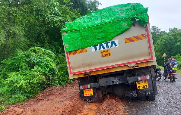 ओणी-अणुस्कुरा रस्त्यावरील खड्ड्यात रूतले वाहन