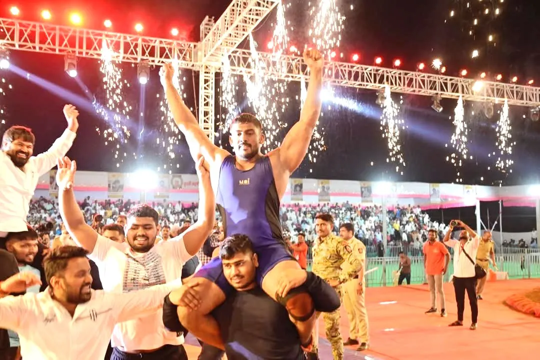 कर्जत, अहिल्यानगर : मानाच्या आणि प्रतिष्ठेच्या महाराष्ट्र केसरी अंतिम सामन्यात सोलापूरच्या वेताळ शेळके याने मानाची महाराष्ट्र केसरी गदा पटकावली आहे. वेताळने अंतिम सामन्यात मुंबईच्या पृथ्वीराज पाटील याचा 7-1 असा पराभव करत महाराष्ट्र केसरी या गदेवर आपले नाव कोरले. दरम्यान, महाराष्ट्र केसरी कुस्ती परिषद व आमदार रोहित पवार तुमच्या पुढाकारामधून अहिल्यानगर जिह्यातील कर्जत श्री संत सद्गुरु गोदड महाराज क्रीडा संकुल या ठिकाणी महाराष्ट्र केसरी स्पर्धेचे आयोजन करण्यात आले होते. यावेळी ज्येष्ठ नेते शरद पवार यांच्या हस्ते मानाची महाराष्ट्र केसरीची चांदीची गदा देण्यात आली. यावेळी, जयंत पाटील, हर्षवर्धन पाटील, खासदार नामदेव मोहिते, खासदार निलेश लंके उपस्थित होते.