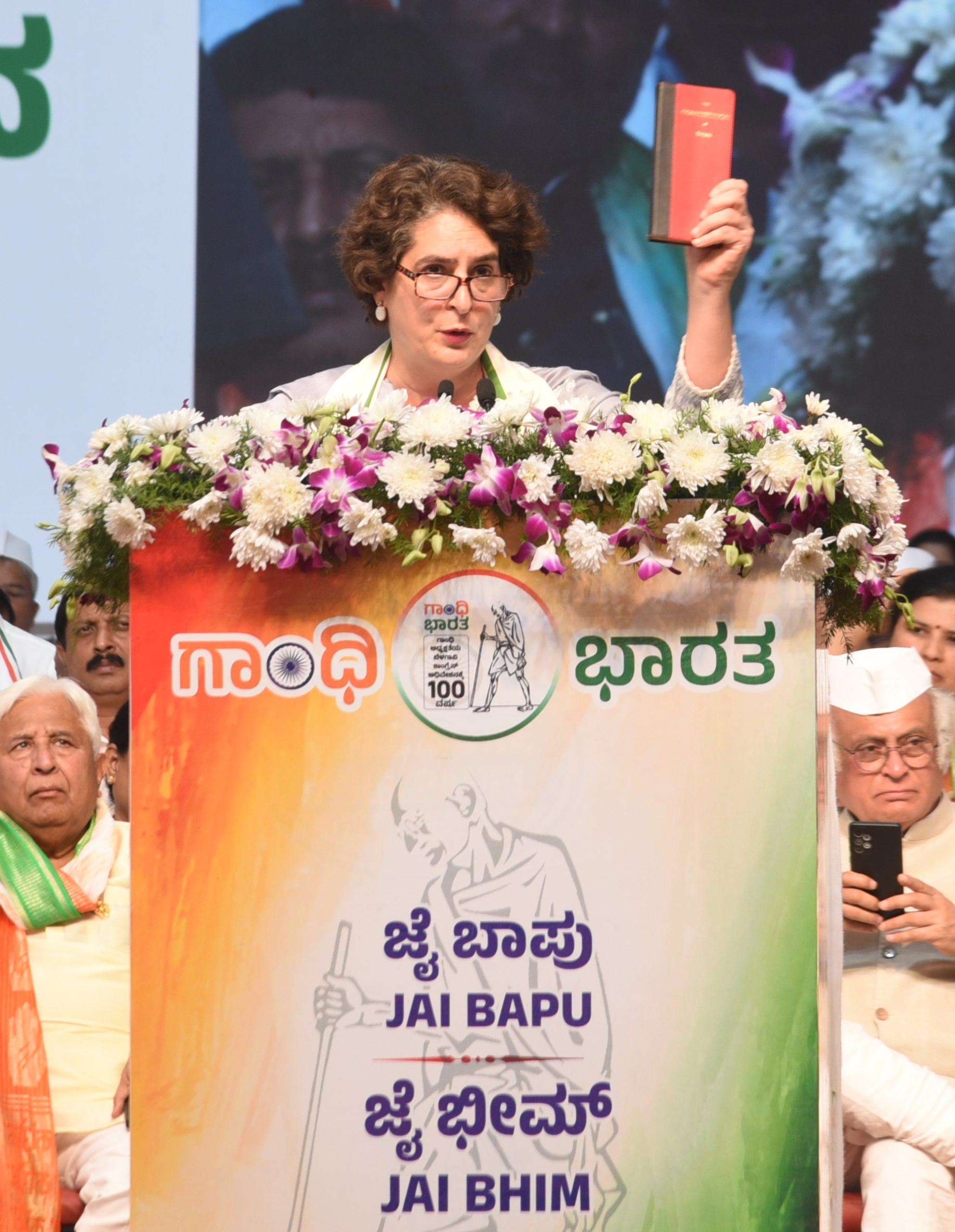 काँग्रेस खासदार प्रियांका गांधी यांनी बेळगाव येथे 'जय बापू, जय भीम आणि जय संविधान' रॅलीदरम्यान सभेला संबोधित करताना