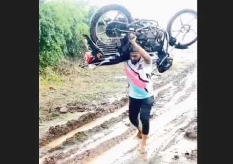 माण तालुक्यातील कुळकजाई येथील विनय घोरपडे या तरुणाने रस्त्याच्या दुरावस्थेमुळे चक्क मोटारसायकल खांद्यावर घेऊन चालत गेला. त्याचा हा व्हिडिओ चांगलाच गाजत असून ‘बाहुबली’ चित्रपटातील गाणे या फोटोला, व्हिडिओला जोडल्याने सोशल मीडियावर या प्रतिक्रियांचा पाऊस पडत आहे.