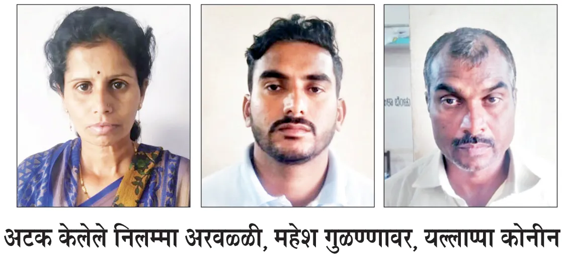 बेळगाव : वण्णूर (ता. बैलहोंगल) येथील युवकाच्या खुनाचा उलगडा झाला आहे. त्याच्या पत्नीनेच दीड लाखाची सुपारी देऊन पतीचा काटा काढल्याचे पोलीस तपासात उघडकीस आले असून नेसरगी पोलिसांनी याप्रकरणी तिघा जणांना अटक केली आहे. यल्लाप्पा दुंडाप्पा कोनीन (वय 53), निलम्मा निंगाप्पा अरवळ्ळी ऊर्फ अरमुकळी (वय 38), महेश बसवराज गुळण्णावर (वय 27) तिघेही राहणार वण्णूर अशी अटक करण्यात आलेल्या तिघा जणांची नावे आहेत. नेसरगीचे पोलीस निरीक्षक राघवेंद्र हवालदार, कित्तूरचे पोलीस उपनिरीक्षक प्रवीण गंगोळ, नेसरगीचे पोलीस उपनिरीक्षक आर. बी. गौडर व त्यांच्या सहकाऱ्यांनी ही कारवाई केली आहे.