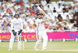 तीन सामन्यांच्या या कसोटी मालिकेत इंग्लंडने पहिल्या सामन्यात विंडीजचा डावाने मोठा पराभव करून आघाडी घेतली. त्यानंतर नॉटींगहॅमच्या दुसऱ्या सामन्यात इंग्लंडने पहिल्या डावात 416 धावांचा डोंगर उभा केला. पण विंडीजने इंग्लंडला चोख प्रत्युत्तर दिले. विंडीजने 5 बाद 351 या धावसंख्येवरून तिसऱ्या दिवसाच्या खेळाला पुढे प्रारंभ केला आणि त्यांचे शेवटचे 5 गडी 106 धावांची भर घालत तंबूत परतले. विंडीजच्या पहिल्या डावात 457 धावा झाल्या. हॉजने 19 चौकारांसह 120, अथांझेने 1 षटकार आणि 10 चौकारांसह 82, डिसिल्वाने 3 षटकार आणि 10 चौकारांसह 82, शमार जोसेफने 27 चेंडूत 2 षटकार आणि 5 चौकारांसह 33, लुईसने 2 चौकारांसह 21, होल्डरने 4 चौकारांसह 27, कर्णधार ब्रेथवेटने 8 चौकारांसह 48 धावा जमविल्या. इंग्लंडतर्फे वोक्सने 84 धावात 4, अॅटकीनसन व शोयब बशीर यांनी प्रत्येकी 2 तसेच स्टोक्स व वूड यांनी प्रत्येकी 1 गडी बाद केला. विंडीजचा पहिला डाव शनिवारी खेळाच्या तिसऱ्या दिवशी उपहारावेळी संपुष्टात आला.