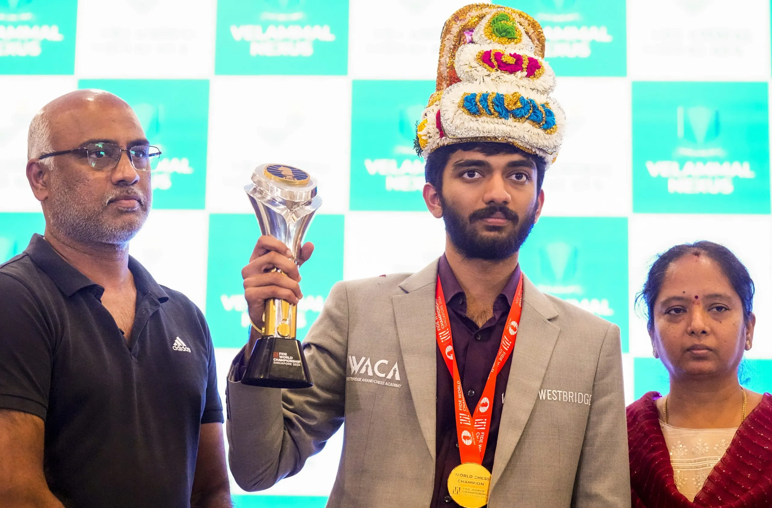 कामराज विमानतळावर तो पोहोचताच तामिळनाडूच्या क्रीडा विकास प्राधिकरणाच्या अधिकाऱ्यांनी आणि त्याच्या वेलाम्मल विद्याला शाळेच्या कर्मचाऱ्यांनी त्याचे स्वागत केले आणि नंतर विमानतळाच्या लाउंजमध्ये शाल घालून स्वागत करण्यात आले. वेलाम्मल शाळेतून गुकेशने त्याचा बुद्धिबळाचा प्रवास सुरू केला होता. वाट पाहणाऱ्या चाहत्यांनी स्वागत केल्यानंतर गुकेश फुलांनी सजविलेल्या आणि त्याचे छायाचित्र लावलेल्या कारने घरी निघून गेला. आज मंगळवारी त्याचे वल्लाहजाह रोड येथील कलैवनार अरंगम येथे भव्य स्वागत केले जाईल आणि त्याला एका खास मिरवणुकीने प्रतिष्ठित सभागृहात नेले जाईल. गुकेशला पाच कोटी ऊपयांचा धनादेश देण्यासाठी तमिळनाडूचे मुख्यमंत्री एम. के स्टॅलिन या कार्यक्रमादरम्यान उपस्थित राहण्याची अपेक्षा आहे.