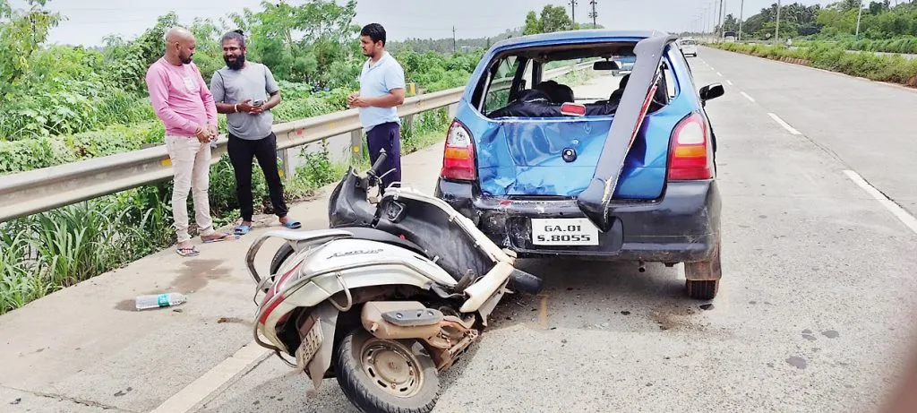 करासवाडाहून पर्वरीच्या दिशेने जाणाऱया कार चालकाने अचानक कार हळू करून रिव्हर्स घेत सर्व्हीस रोड गाठण्याचा प्रयत्न करीत असताना पाठीमागून येणाऱया ऍक्टिव्हा चालकाने कारवर जोरदार धडक दिल्याने ऍक्टिव्हा चालक ………हा युवक जबर जखमी झाला असून त्याचे दोन्ही हात जायबंदी झाले आहेत व त्याच्या गुप्तांगाला जबर मार लागल्याने गंभीर अवस्थेत त्याला गोमॅकोत अतिदक्षता विभागात दाखल करण्यात आले आहे. सदर कार पेडणे येथील ट्राफिक पोलिसाची असल्याने म्हापसा पोलीस त्या दुचाकीवाल्याचीच चूक असल्याचे दाखवून हे प्रकरण त्याच्यावर डावललण्याचा डाव आखत असल्याची माहिती हाती आली आहे. याबाबत आम्हाला न्याय द्यावा अशी मागणी जखमीच्या कुटुंबियांनी केली आहे.