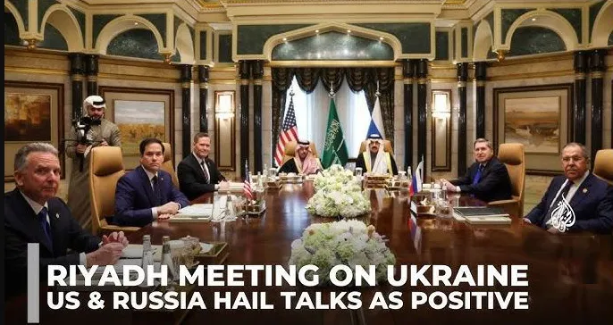 अमेरिकेचे परराष्ट्रमंत्री मार्को रुबियो हे अमेरिकन सिनेटरबरोबर सौदी अरेबियाच्या दौऱ्यावर पोहोचले. त्याच्या पाठोपाठ रशियाचे परराष्ट्रमंत्री सर्जेई लार्वो रियाधमध्ये पोहोचल्यानंतर लागलीच सौदी अरेबियाचे परराष्ट्रमंत्री फैझल बिन फरहान अल् सौद यांच्या नेतृत्वाखाली बैठक घेण्यात आली. डोनाल्ड ट्रम्प आणि ब्लादिमीर पुतीन यांच्यात झालेल्या दूरध्वनीवरील संवादानंतर केवळ पंधरा दिवसांच्या अंतराने रशिया आणि अमेरिकेच्या परराष्ट्रमंत्र्यांची बैठक झाली. उभय पक्षांनी युद्धावर तोडगा काढणारी ही बैठक सकारात्मक झाल्याचे स्पष्ट केले. मात्र या बैठकीसाठी युक्रेनचे राष्ट्राध्यक्ष वोलोदोमीर झेलेन्स्की व युरोपियन देशांना दूर ठेवले.